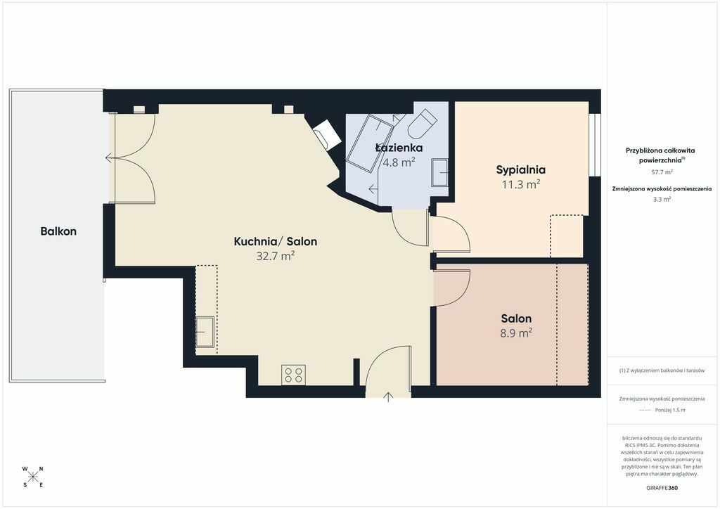 Układ: 2 odrębne sypialnie + salon z aneksem kuchennym (powierzchnia