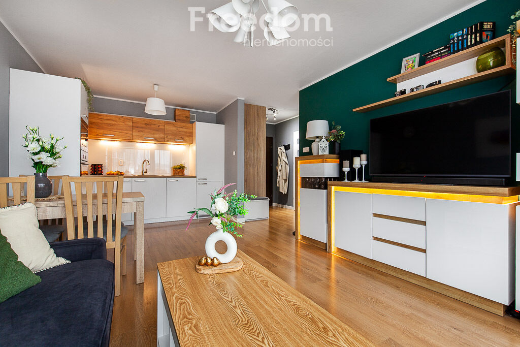 przestronny salon z aneksem kuchennym i wyjściem na słoneczny balkon