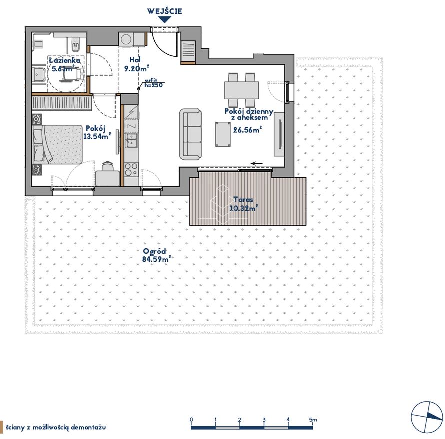Oferta dotyczy mieszkania o ekspozycji wschodniej, z ogrodem o powierzchni 84,59 m2, w którym rozkład kształtuje się następująco: