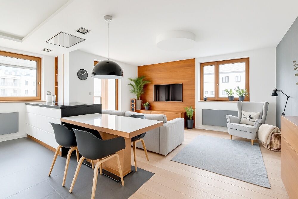 • Salon z aneksem kuchennym – 34,8 m² + wyjście na przestronny taras - 16,2 m2