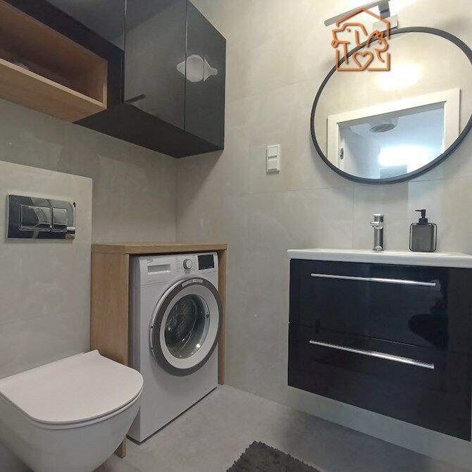 Łazienka z WC: pralka, kabina prysznicowa, umywalka, szafki, WC.