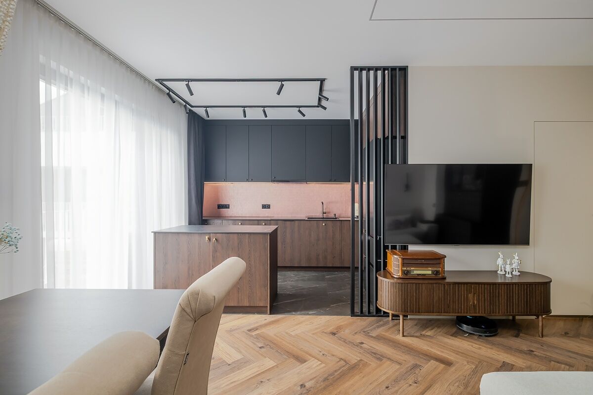 Salon wraz z oddzielną strefą jadalnianą oraz ukrytym w zabudowie stolarskiej biurem. Zabudowa wykonana z tych samych materiałów co kuchnia, tworząc spójną przestrzeń.