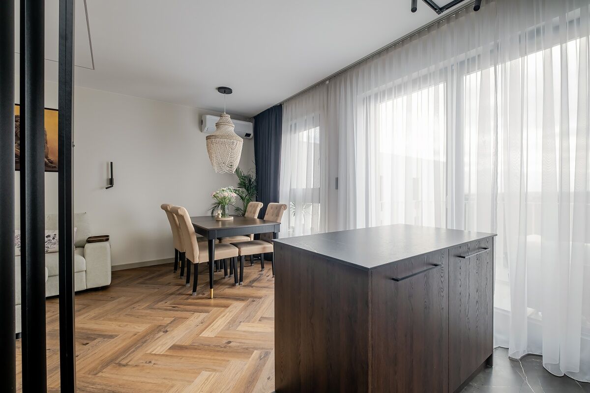 W salonie znajdują się również takie udogodnienia jak elektryczny karnisz, który obsłużymy zarówno pilotem jak i smartfonem. Rozwiązanie to umożliwi nam wyciemnienie pomieszczenia zasłonami black-out szytymi na zamówienie gwarantując 100% prywatności.