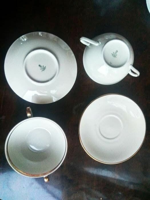 W delikatnym kolorze ecru, ze złoceniami na krawędziach.