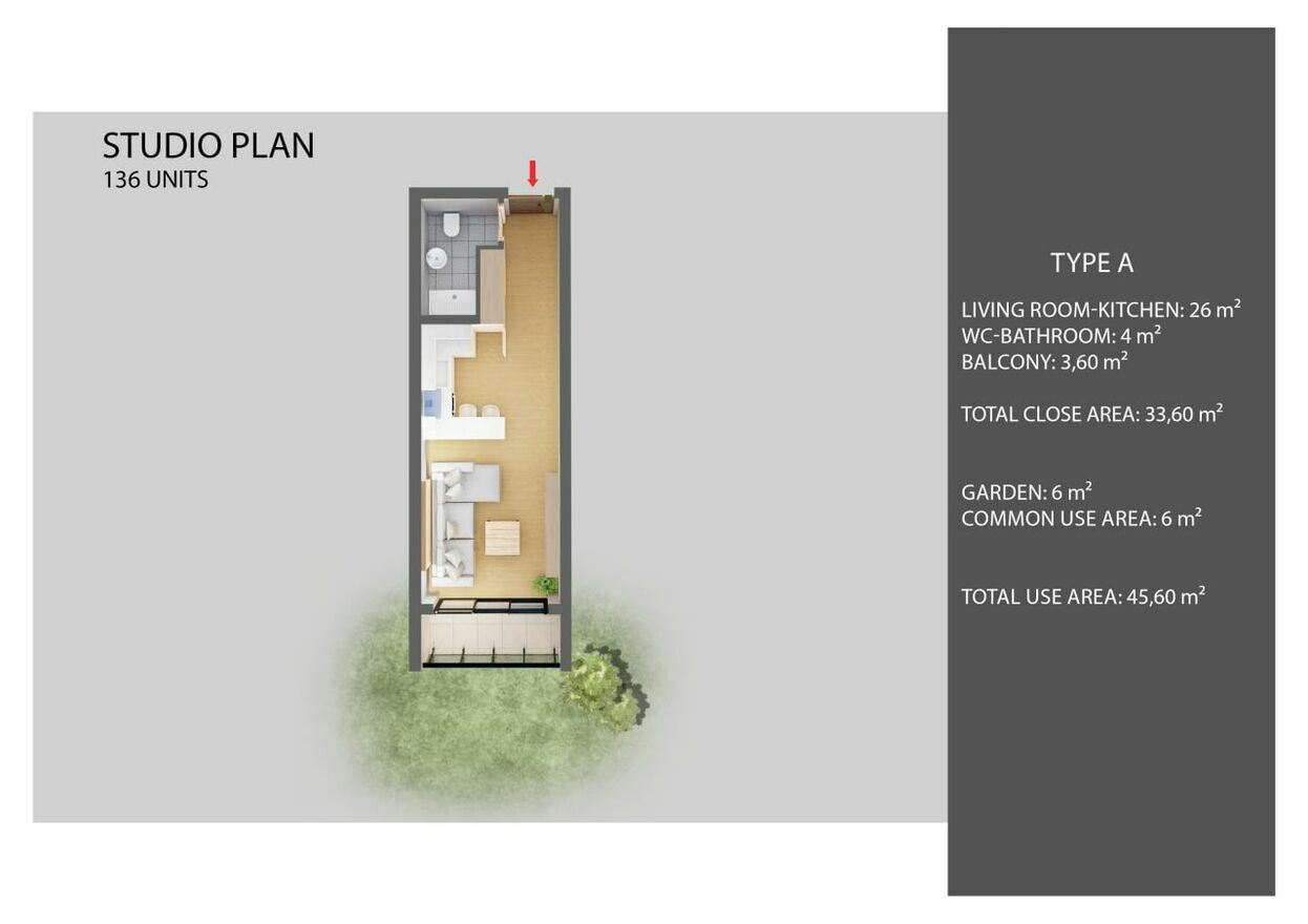 Wyjątkowe studio z tarasem i prywatnym wyjściem do basenu | La Joya Perla, IskeleNa sprzedaż unikatowe studio o powierzchni 45,6 m², położone na parterze prestiżowego kompleksu La Joya Perla w Iskele (Bahçeler).