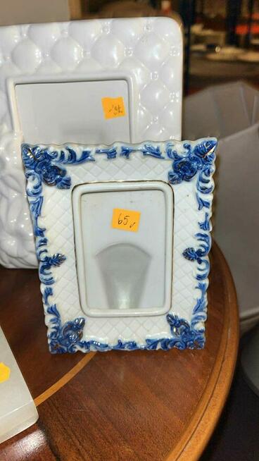 Porcelanowa, biała, stojąca ramka na zdjęcia Z granatowym dekodrem wokół. Cena 65 zł. W świetnym ...
