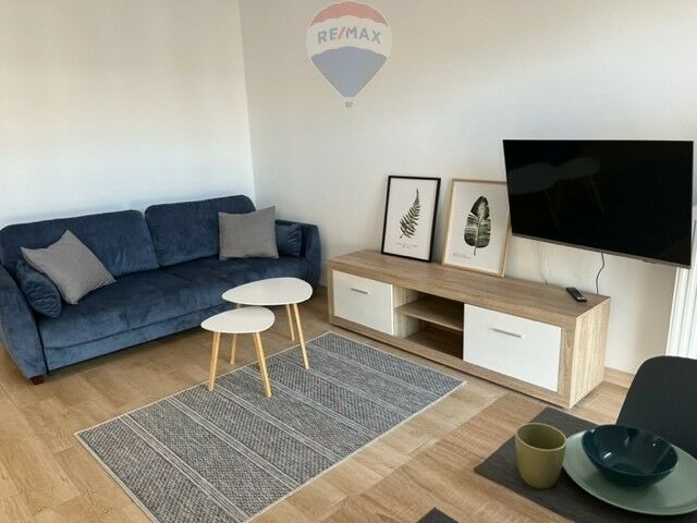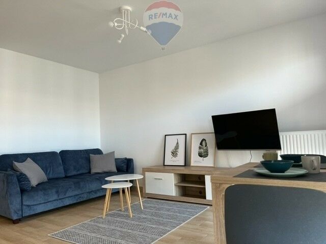Wygodna rozkładana kanapa, komoda, telewizor i stół rozkładany dla
