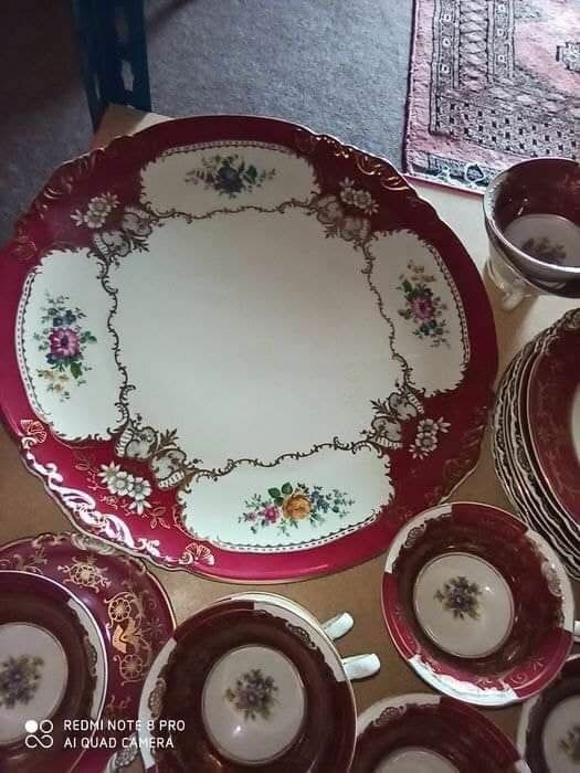 Filiżanka z talerzykiem. Koening pr.Tettau. Import.Bogactwo koloru bordowego, ze złotem.
