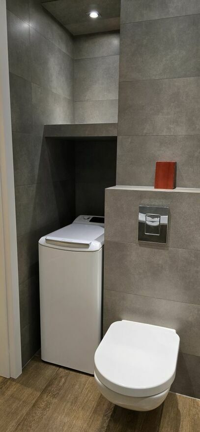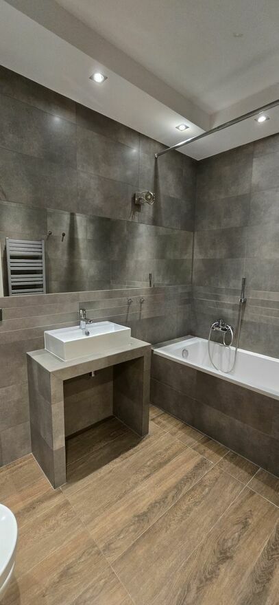 zmywarka Amica, lodówka podblatowa, płyta indukcyjna, piekarnik + mikrofala, pralka, smart TV, wanna, garderoba z oświetleniem etc.