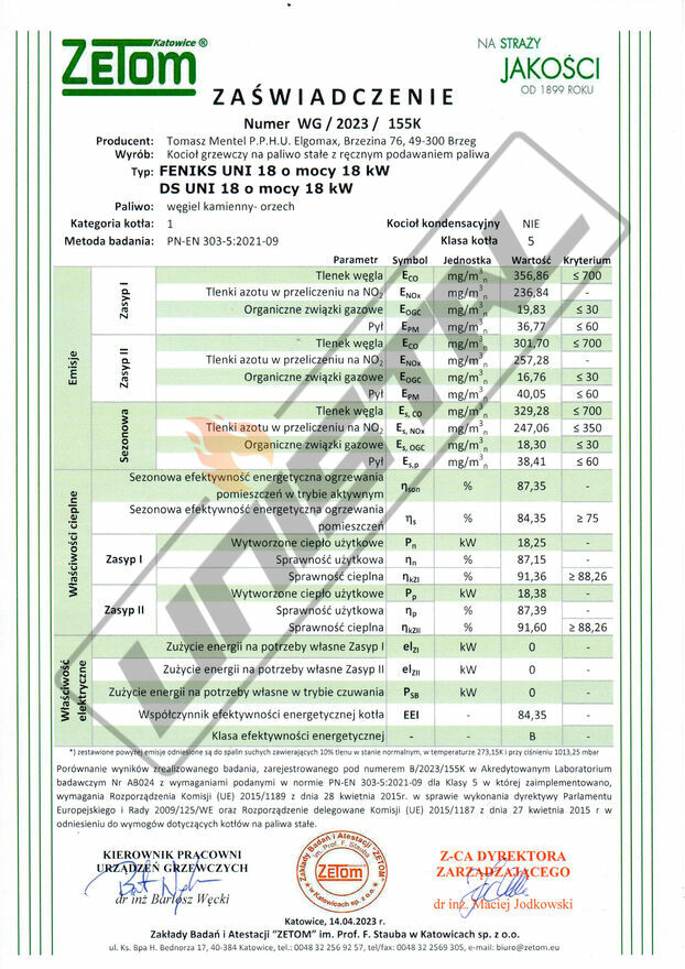 co potwierdza wysokie własności ekologiczne kotła na europejskim poziomie.
