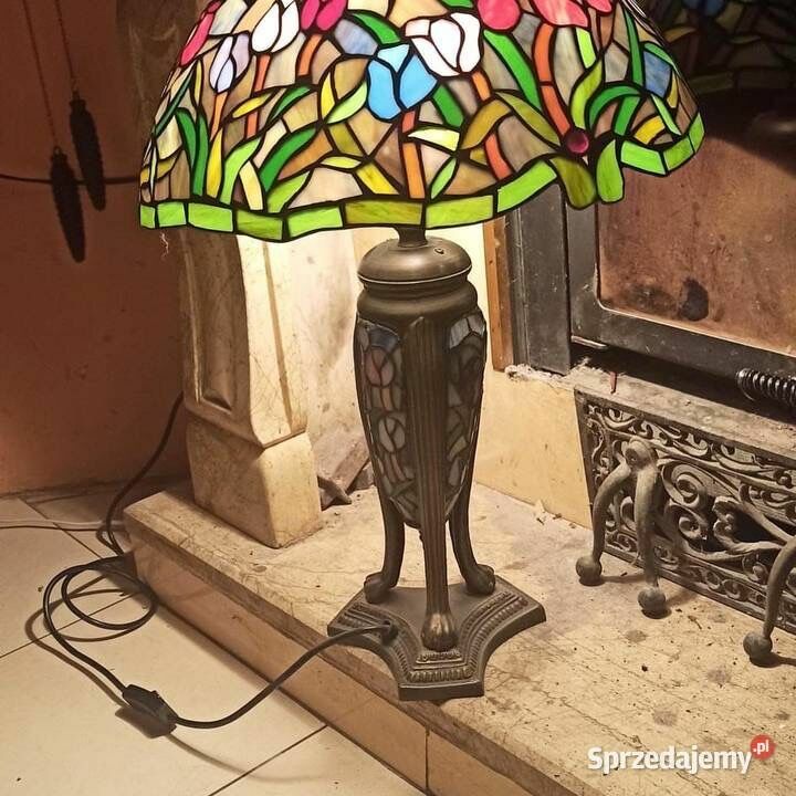 Lampa stojąca, w stylu Tiffany.Motywy kwiatowe na kloszu i na nodze lampy.