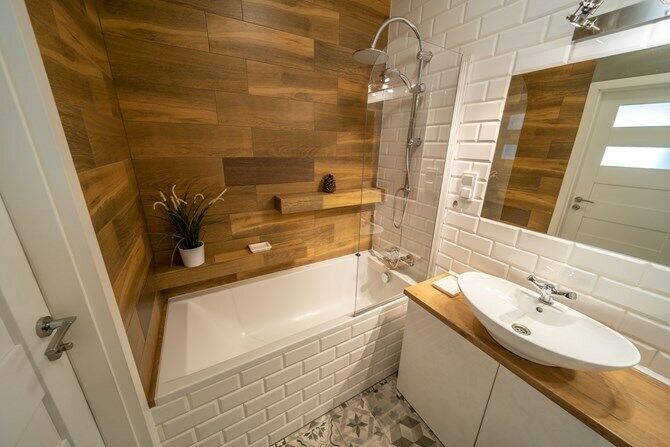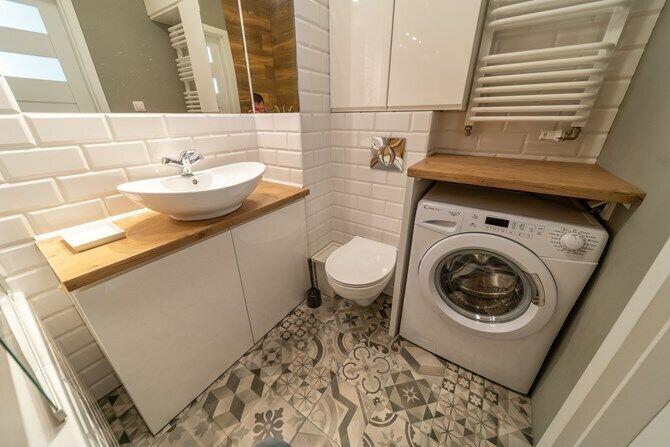 Łazienka razem z WC: lustro, półki, szafki, wanna, umywalka,