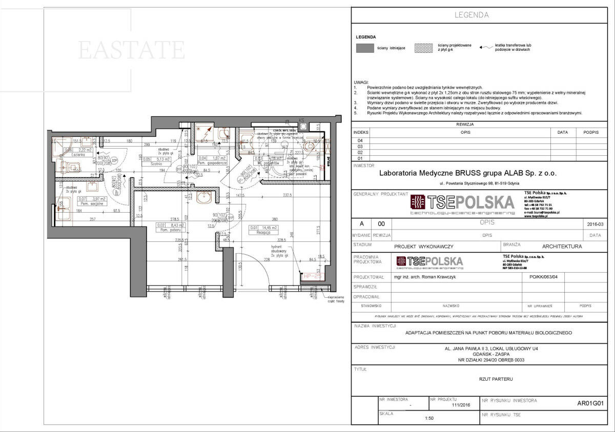 Lokal wcześniej był użytkowany przez punkt pobrań ALAB (BRUSS) - dołączony został zwymiarowany rzut z układem pomieszczeń poprzedniego najemcy, co ułatwia ocenę potencjału przestrzeni. Stan lokalu umożliwia szybkie rozpoczęcie działalności, zwłaszcza o charakterze medycznym, kosmetycznym lub biurowym.