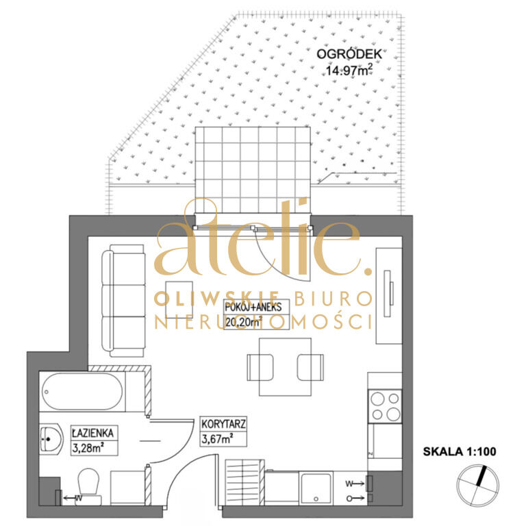- salonu z aneksem kuchennym i możliwością wydzielenia sypialni
