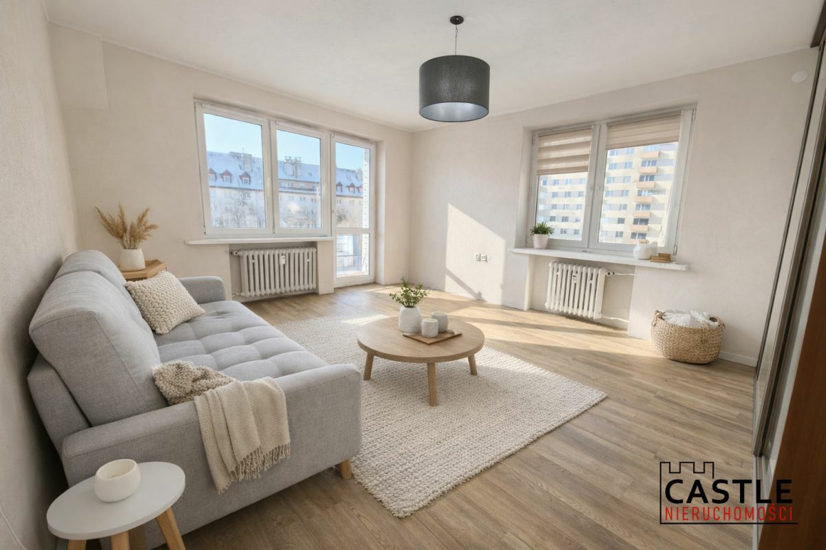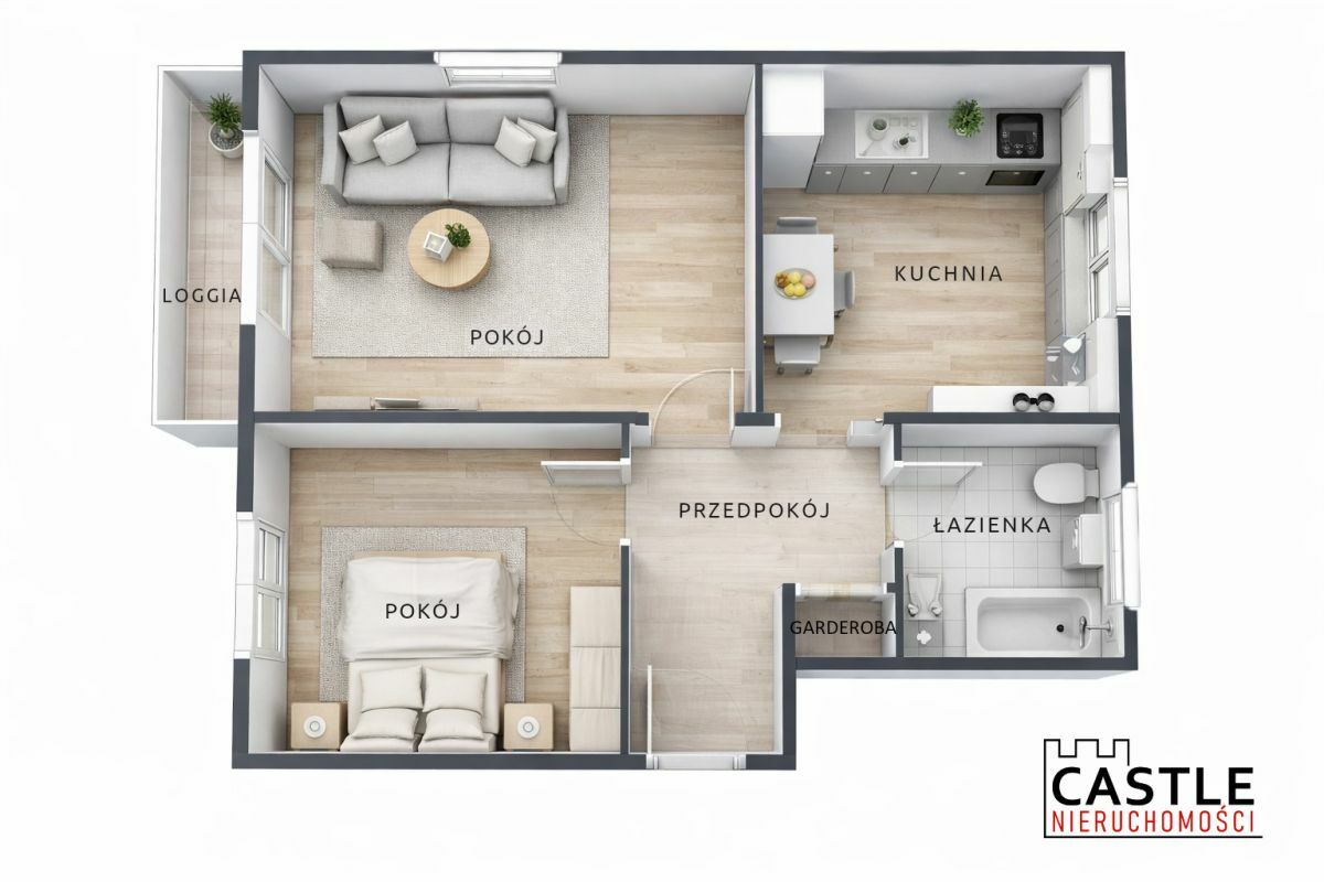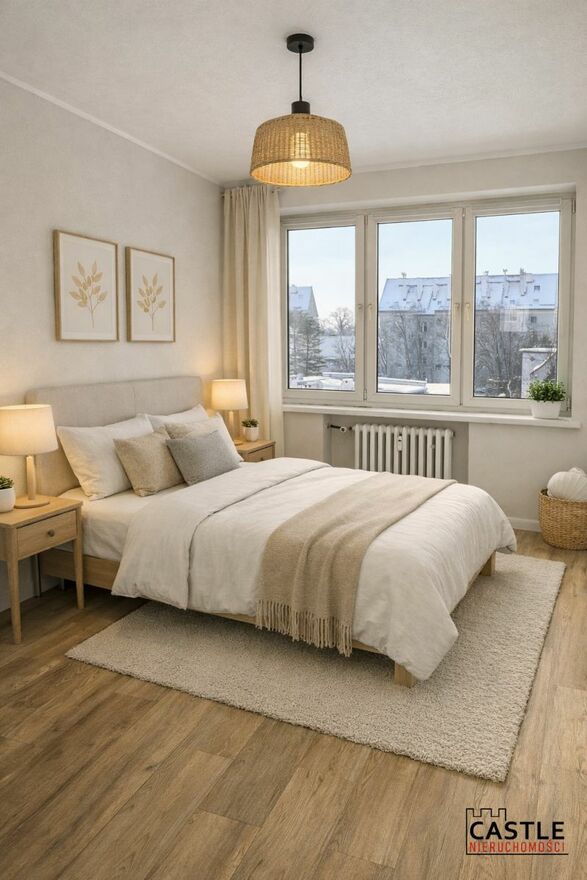 Ogłoszenie zawiera wizualizacje przedstawiające przykładową aranżację wnętrz, przygotowane w celu zaprezentowania potencjału mieszkania.
