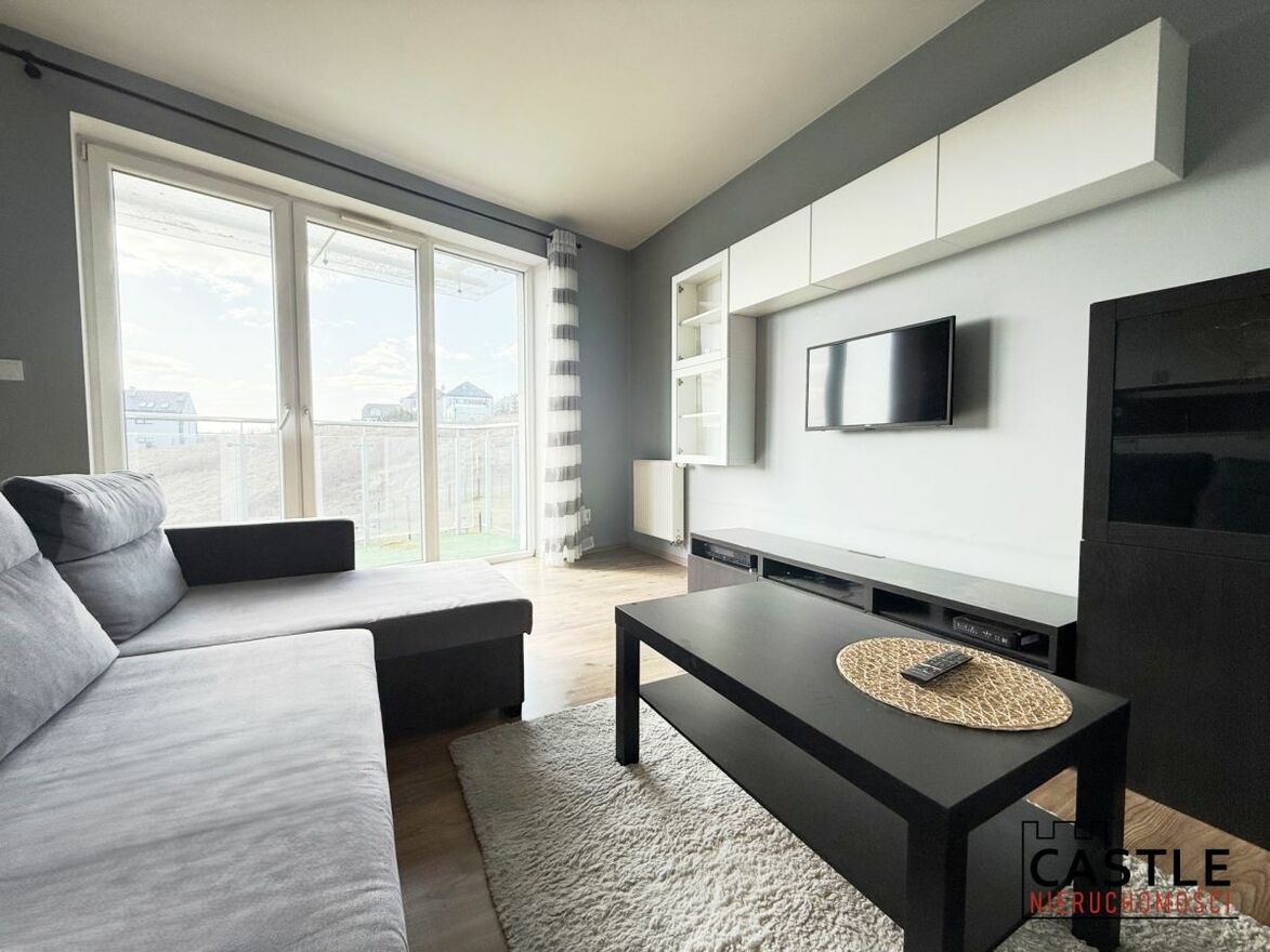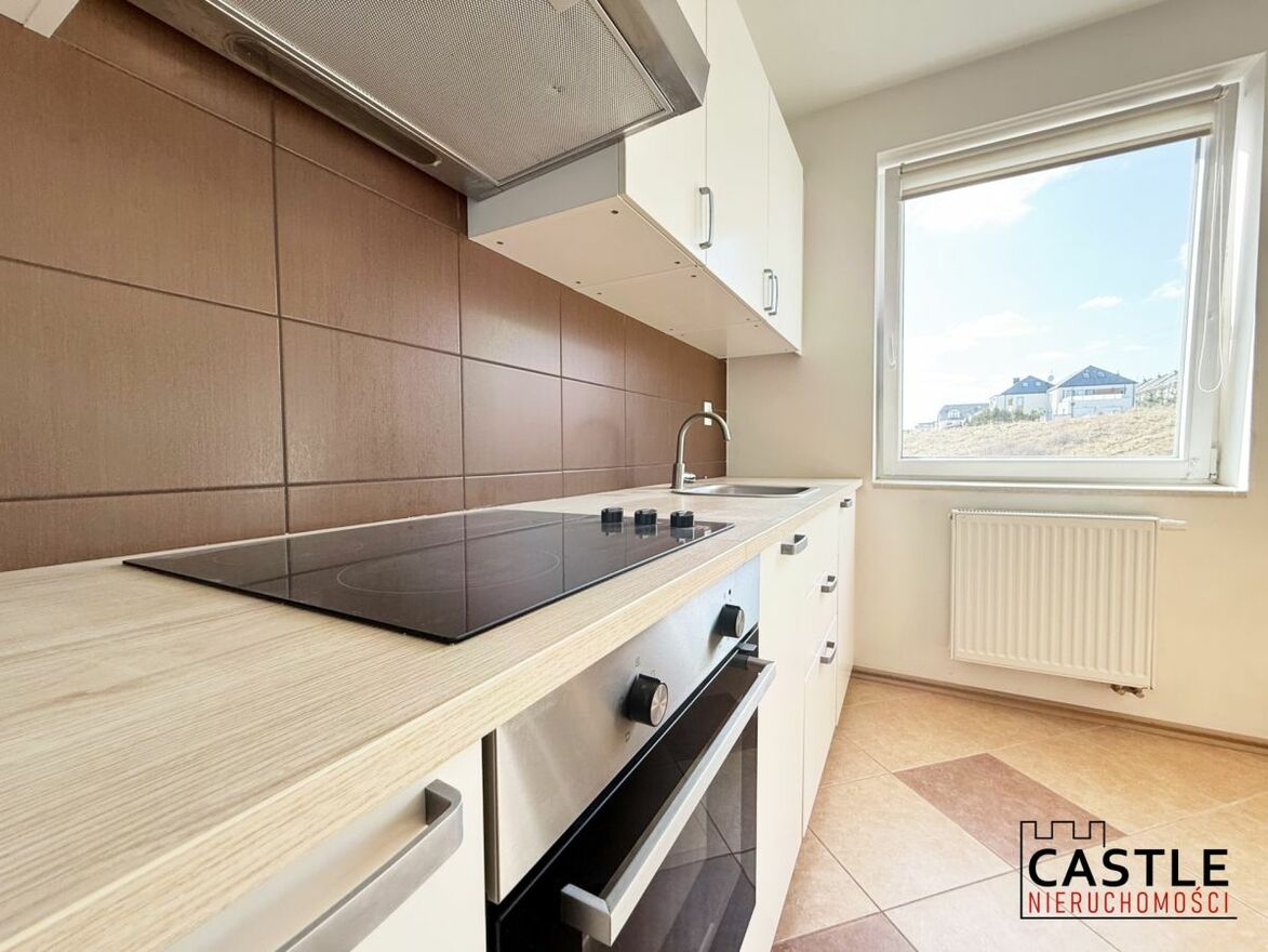 Przestronny salon z aneksem kuchennym i wyjściem na balkon - mieszkanie jest jasne dzięki dużej ilości okien. Od strony balkonu znajduje się zielone wzgórze, które zapewnia prywatność i piękny widok.
