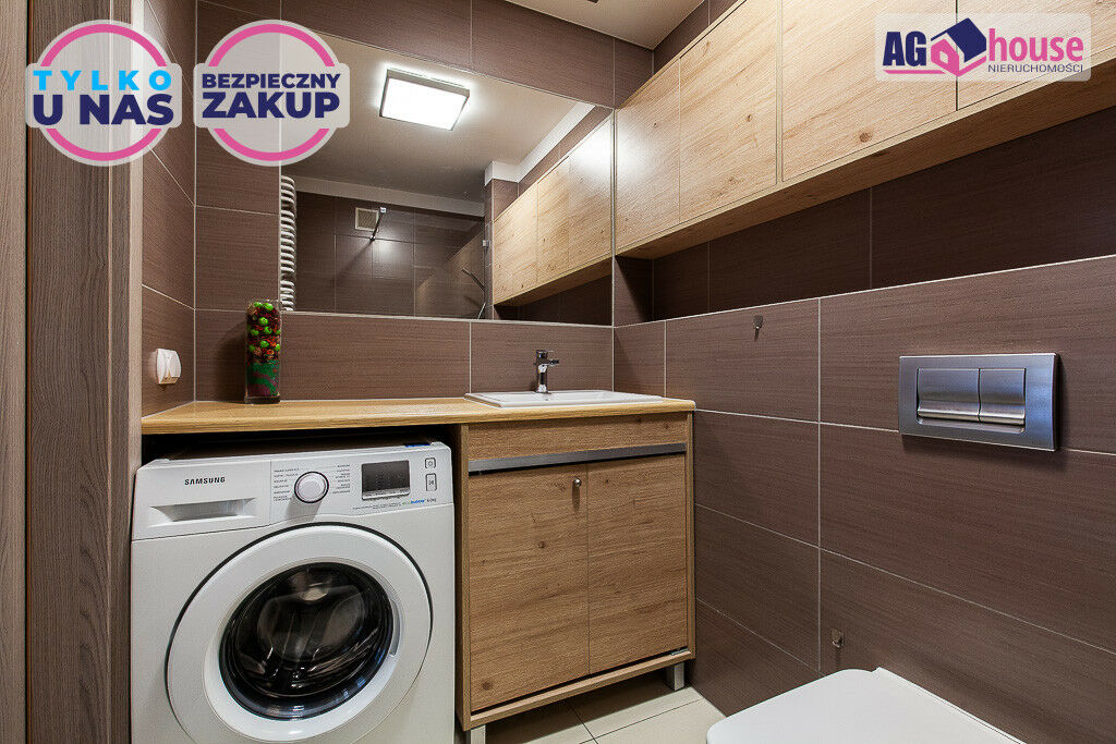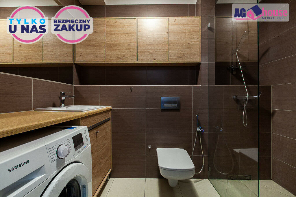 Łazienka została zabudowana meblami na wymiar i wyposażona w pralkę Samsung, prysznic typu walk-in oraz bidetkę.