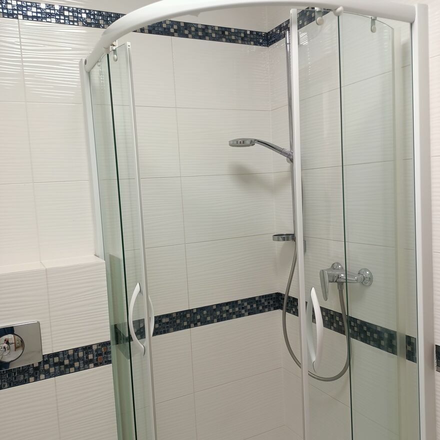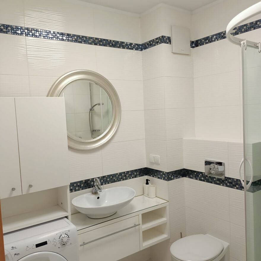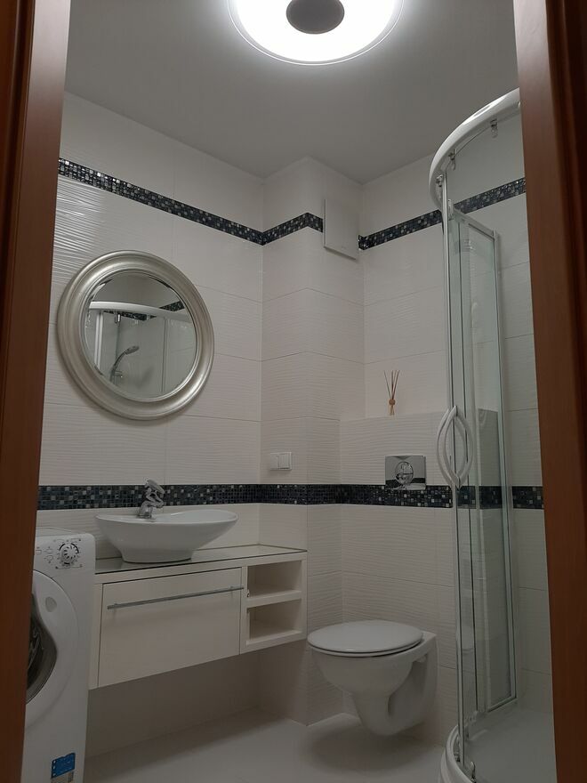 Łazienka z WC wyposażona jest w 90 cm brodzik, pralkę i podwieszaną szafkę z umywalką.