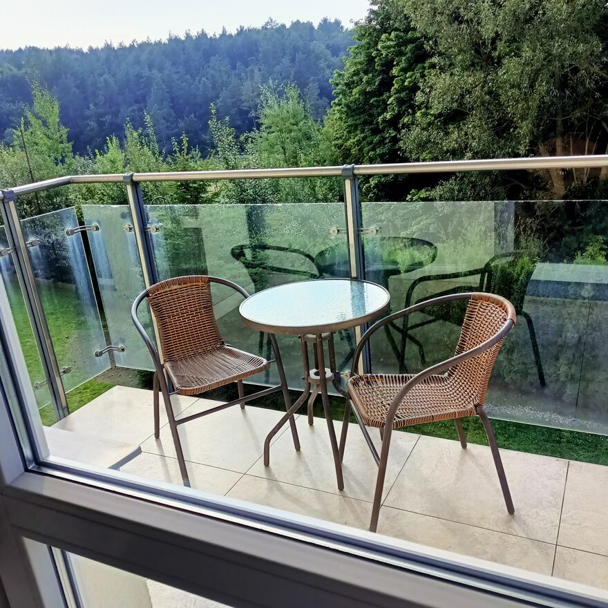 Duży balkon ze stolikiem i krzesełkami, do którego można przejść z pokoju dziennego jest atutem mieszkania.