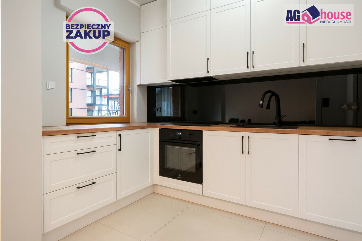 otwarta, nowoczesna kuchnia w bieli z pełnym wyposażeniem i dużym oknem,