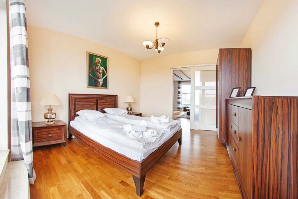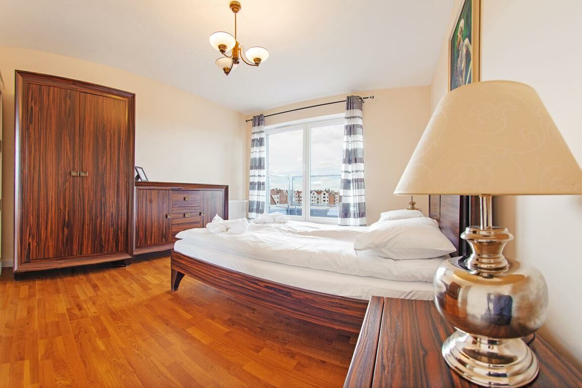 I offer a two-room apartment for rent in the Chmielna Park estate in the centre of Gdańsk, at Chmielna 70 Street. It is an ideal place for 4 people who want to explore the Old Town and admire St. Mary's Church from the window. The apartment is 45 m2. It is on the fifth floor in a modern building with an elevator. It consists of a living room with a kitchenette, a bedroom, a bathroom and a balcony. The living room has a sofa bed, TV and table. The kitchen is fully equipped with household appliances, dishes and cutlery. The bedroom has a double bed, wardrobe and a chest of drawers. The bathroom has a shower, sink and toilet. There is another wardrobe in the hall. Bed linen, towels, internet and television are available to guests. There is a playground for children on the estate.