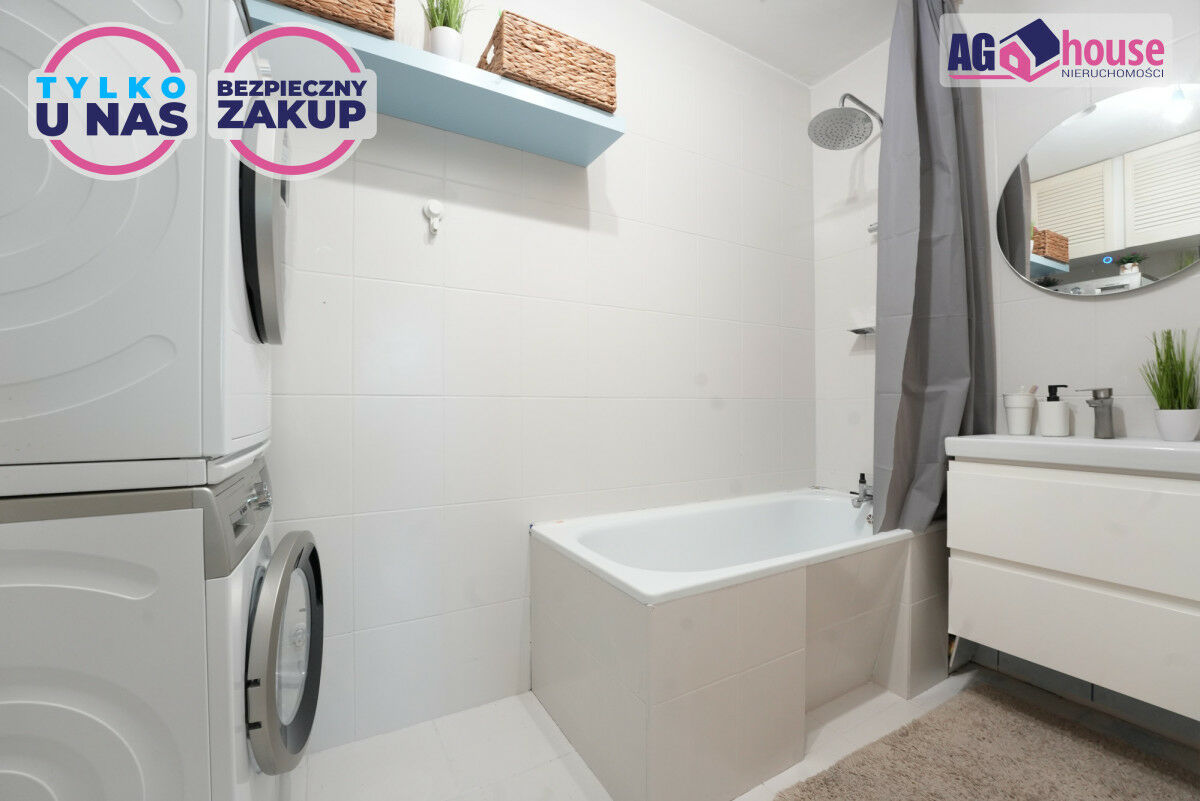 Łazienka z wanną i miejscem na pralkę i suszarkę,