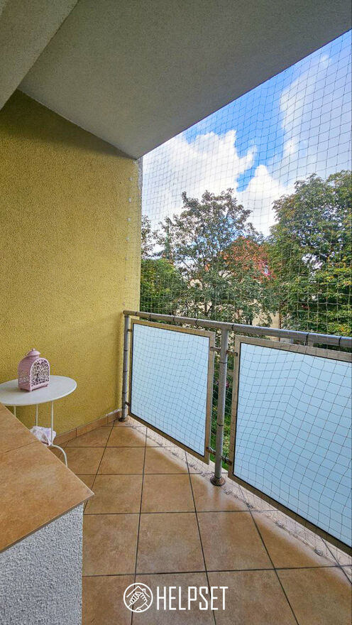 Składa się salonu z balkonem, osobnej kuchni, sypialni, przedpokoju oraz łazienki z prysznicem.