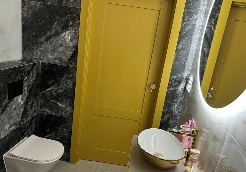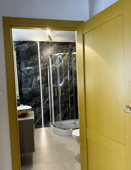 Wnętrze jest umeblowane i nowoczesne wyposażone w wysokiej jakości sprzęt AGD, w tym pralkę, zmywarkę i lodówkę.