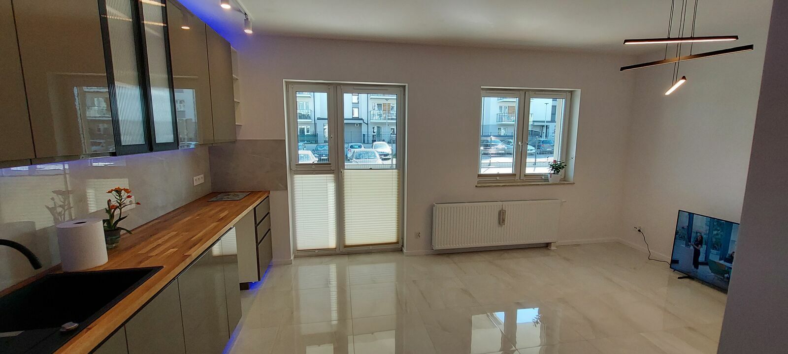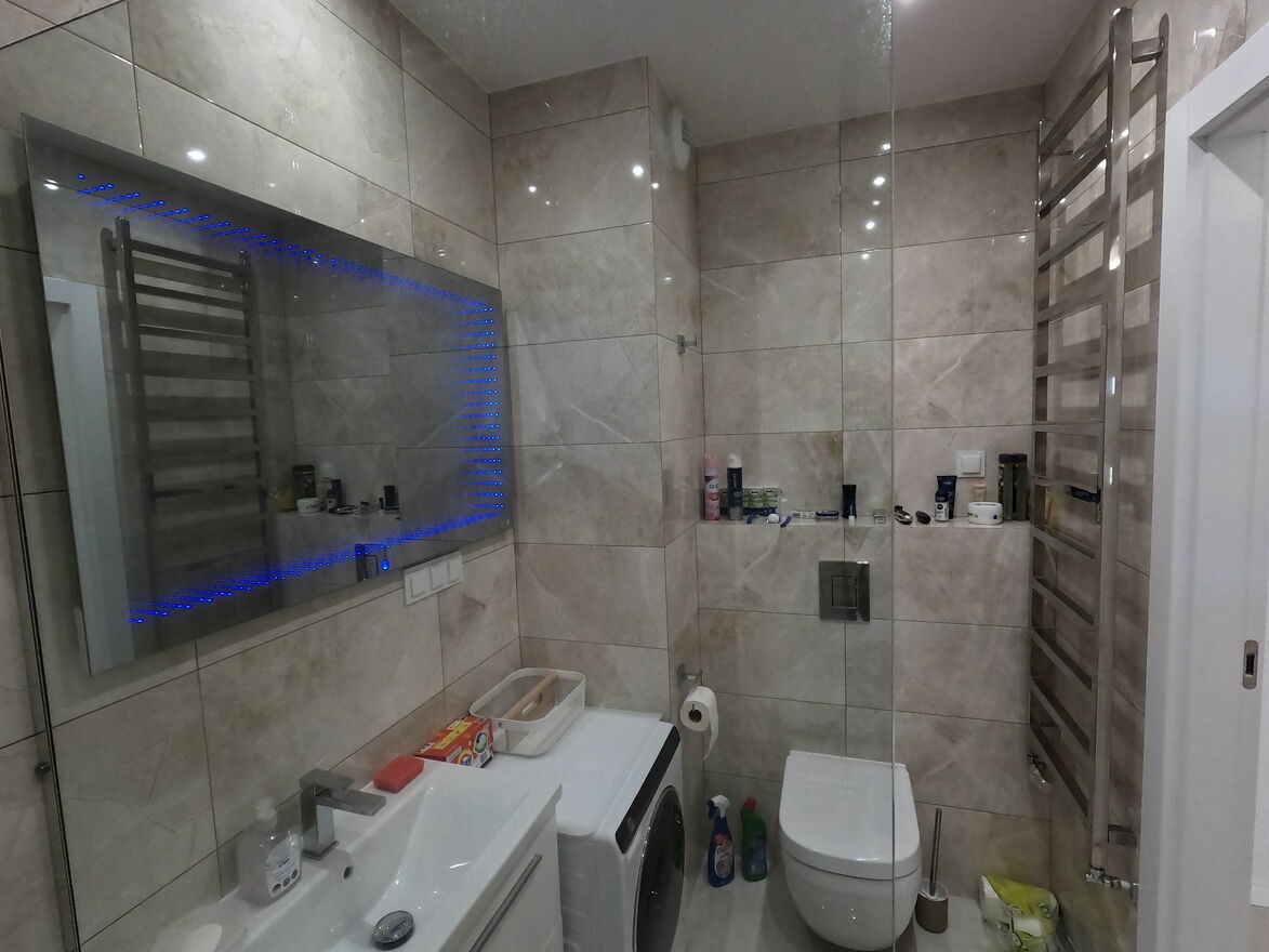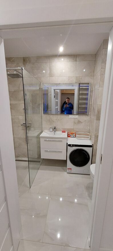 Mieszkanie posiada pralkę w łazience oraz posiada miejsce na dodatkową pralkę najemcy lub suszarkę w kuchni. Prysznic typu walk-in z deszczownicą. W salonie telewizor 55" jako opcja, dostępna telewizja naziemna DVBT oraz SAT. W przedpokoju pawlacz oraz miejsce na dwie wielkie szafy.