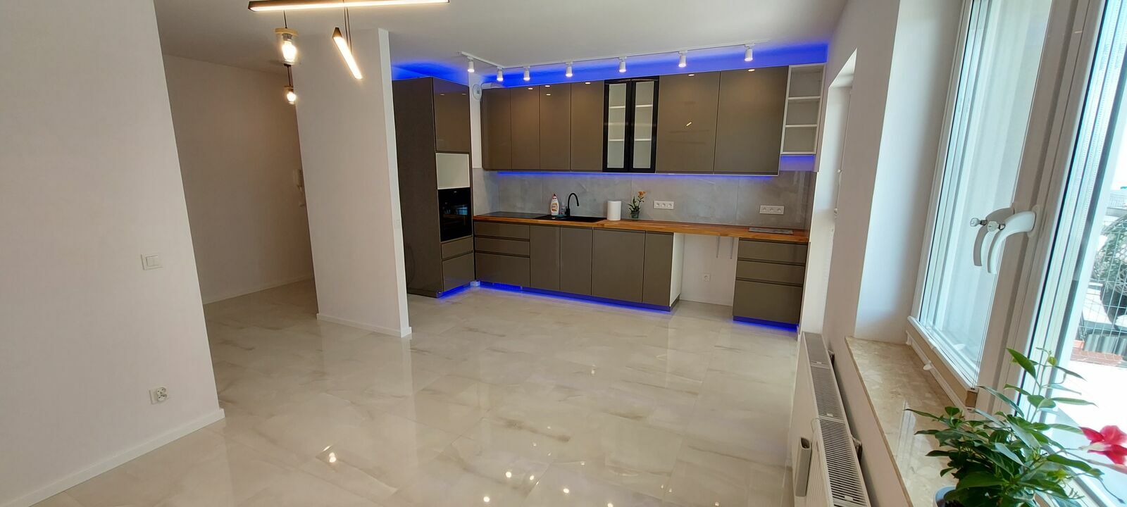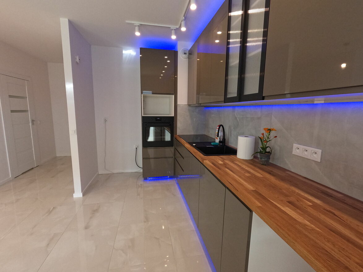 Mieszkanie posiada zabudowe kuchenną z AGD: okap elektryczny, płyta indukcyjna szeroka, zmywarka oraz pierkarnik elektryczny, brak lodówki z możliwością wstawienia swojej nawet dwudrzwiowej o szerokości do 95 cm.