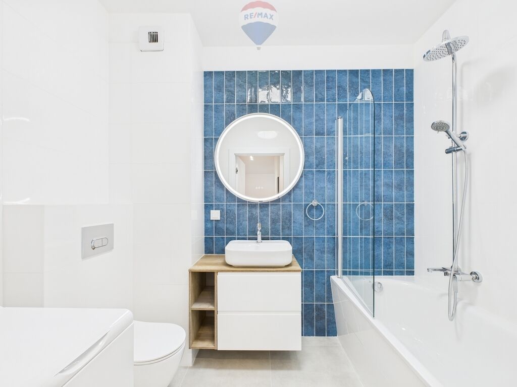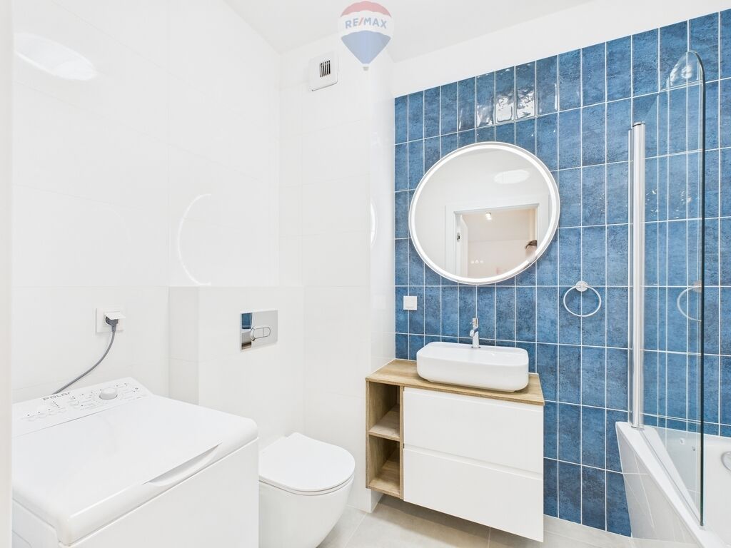 elegancka łazienka z wanną i parawanem prysznicowym, pralka
