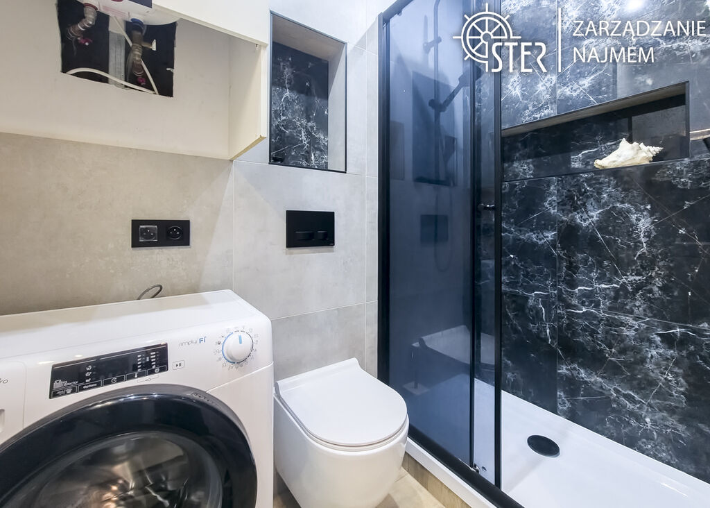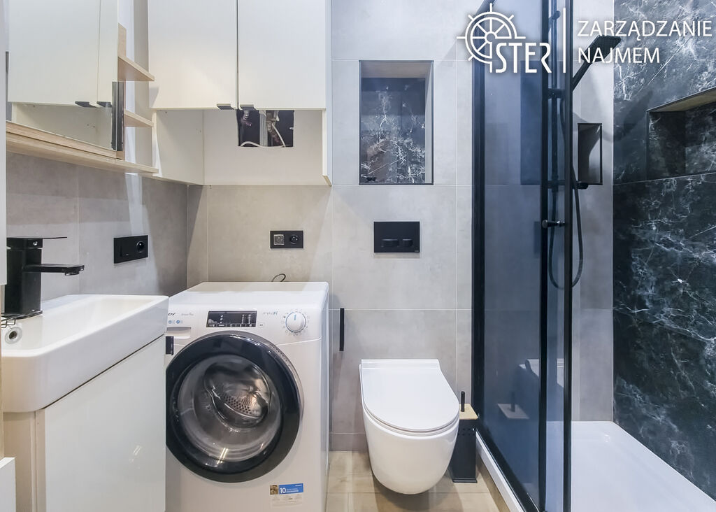 zabudowa meblowa. W łazience prysznic, pralka. W oknach PCV