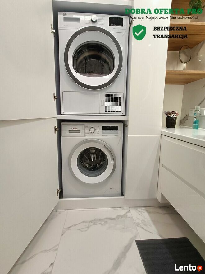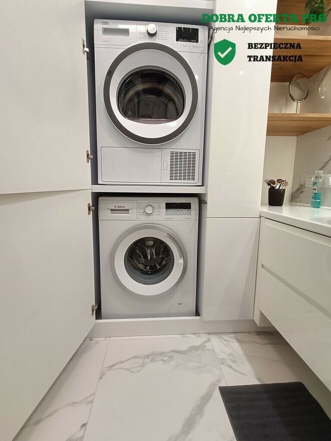 *łazienka z funkcjonalną zabudową, miejscem na pralkę i suszarkę