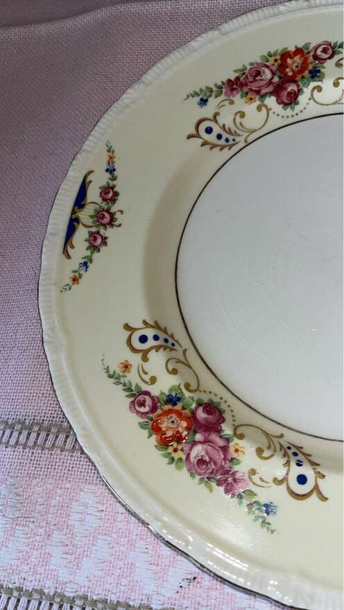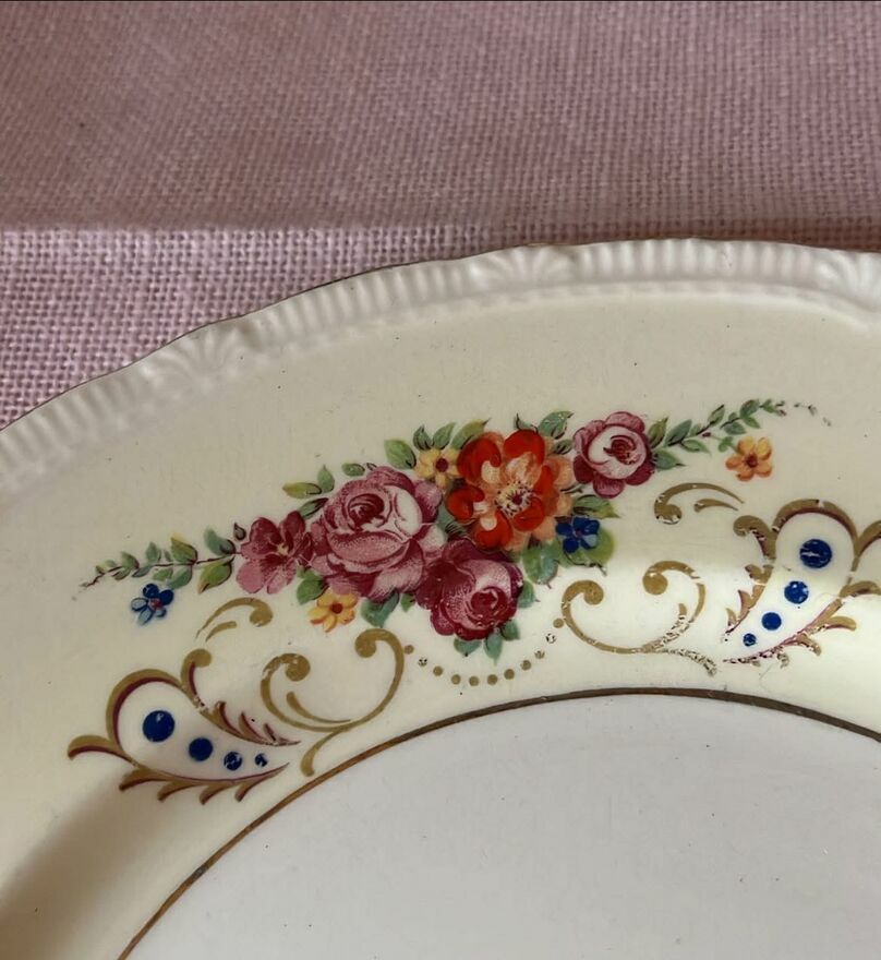 Kwiatuszki i girlandy ręcznie podmalowywane - na kołnierzu talerza - na słonecznym kolorze.