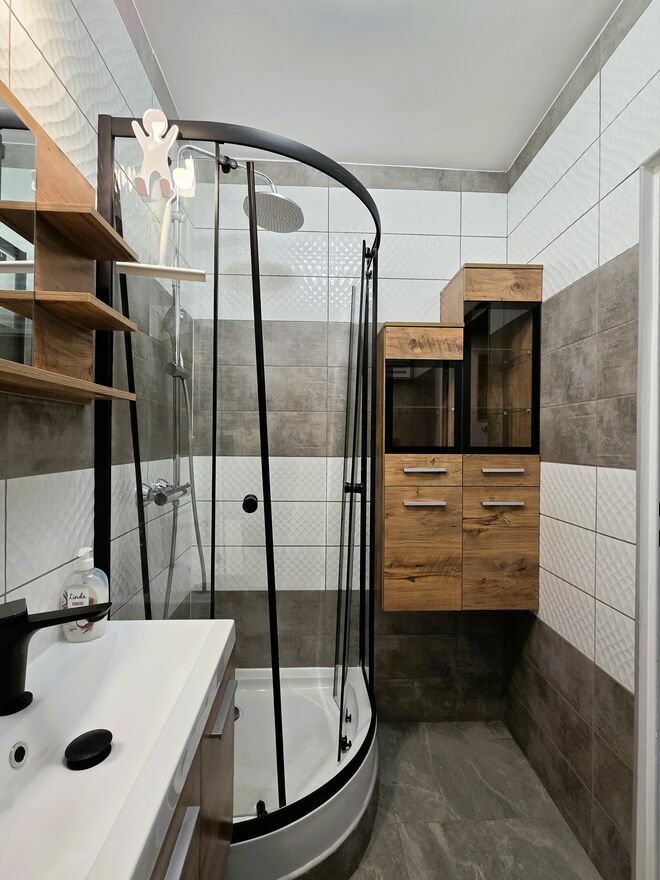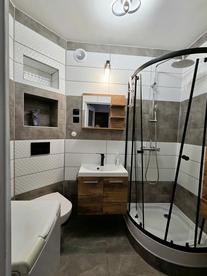 • łazienka: pralka, prysznic, umywalka, toaleta, szafki,