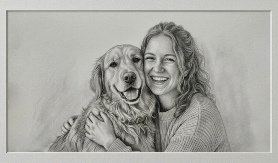 Oryginalna praca ręcznie wykonana ołówkiem i grafitem. Format A4, papier rysunkowy 200 g.Rysunek przedstawia portret kobiety z golden retrieverem – kompozycja zbliżeniowa, staranne odwzorowanie rysów twarzy i sierści psa. Faktura ołówka wyraźnie widoczna w oryginale.