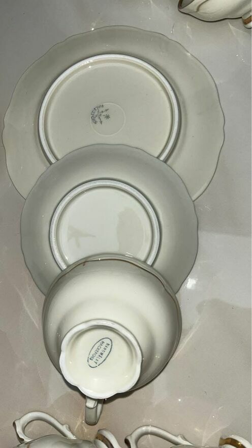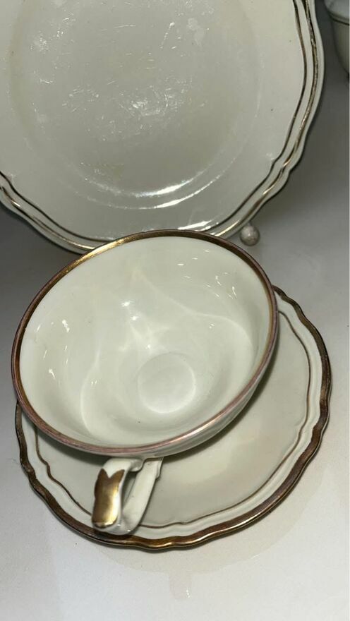 Na talerzykach widać znaki użytkowania- złoto było nakładane naszkliwnie- takie szybciej się ściera.