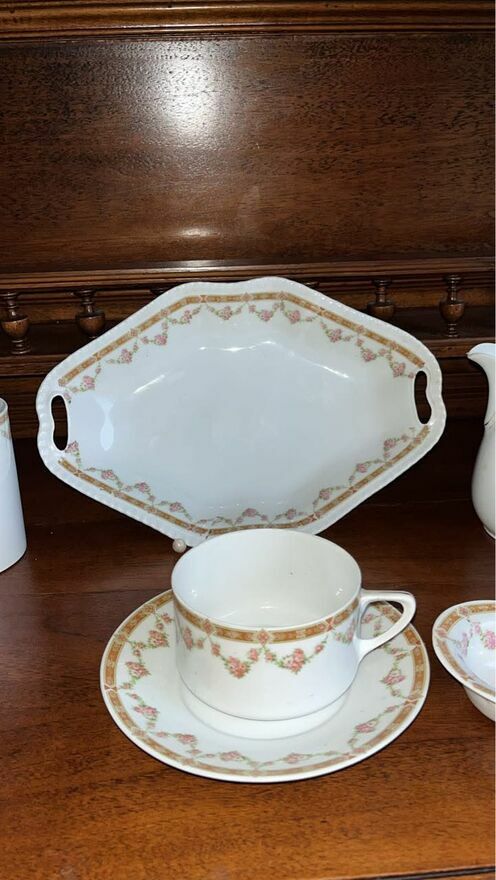 Biała porcelana z drobniutkimi pękami różyczek- różowych. W girlandach.
