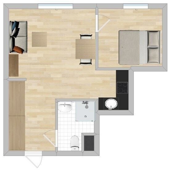 Składa się z salonu, sypialni, kuchni, łazienki z WC oraz