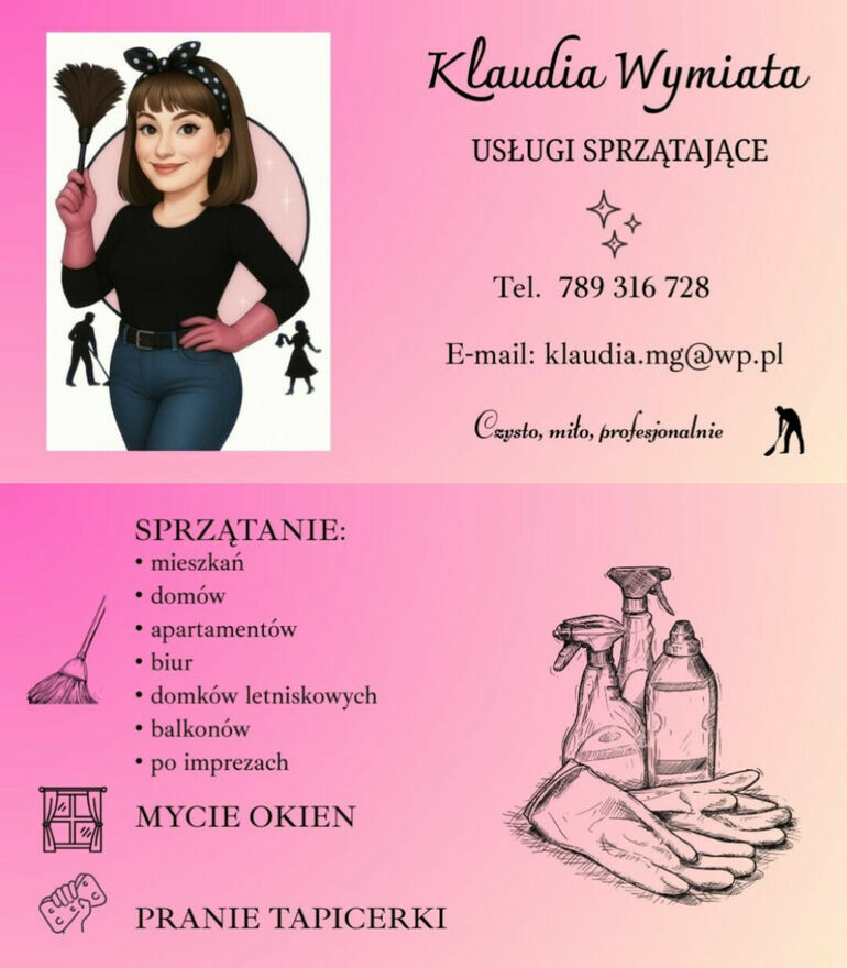 - Zakres usług:Sprzątanie biur, Sprzątanie mieszkań i domów