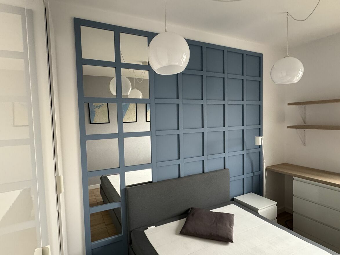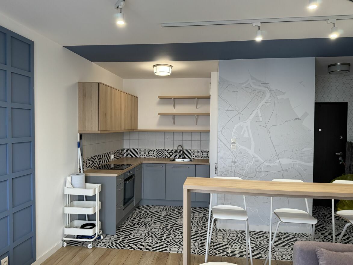 Kuchnia wyposażona w sprzęt AGD (lodówka z zamrażalką, kuchenka indukcyjna, piekarnik, zmywarka, okap). W salonie rozkładana 2-osobowa sofa, stolik, szafka rtv. Sypialnia posiada duże komfortowe łózko, biurko, półki na książki oraz szafę.