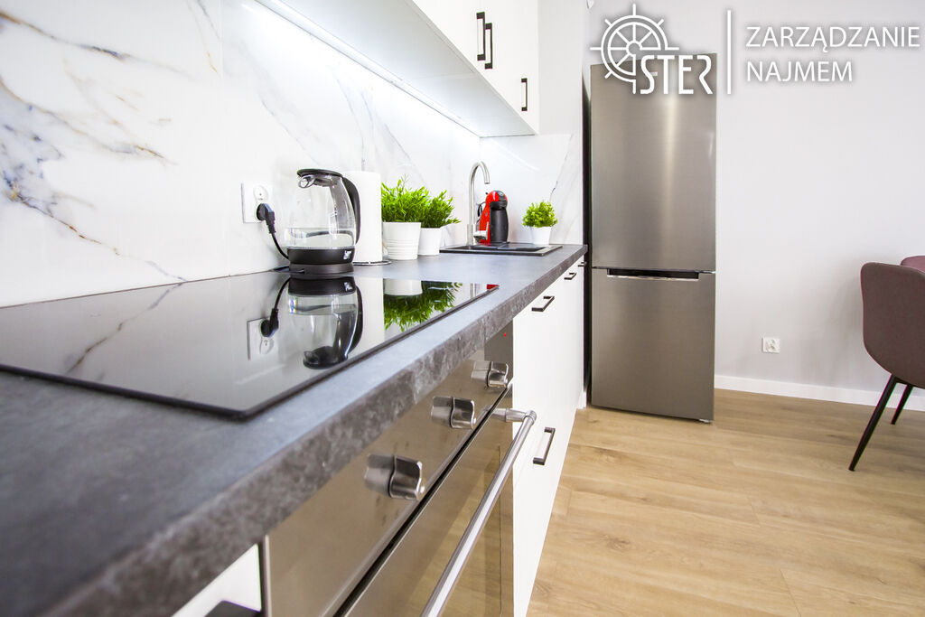 W części kuchennej m.in zmywarka, lodówka, płyta indukcyjna,