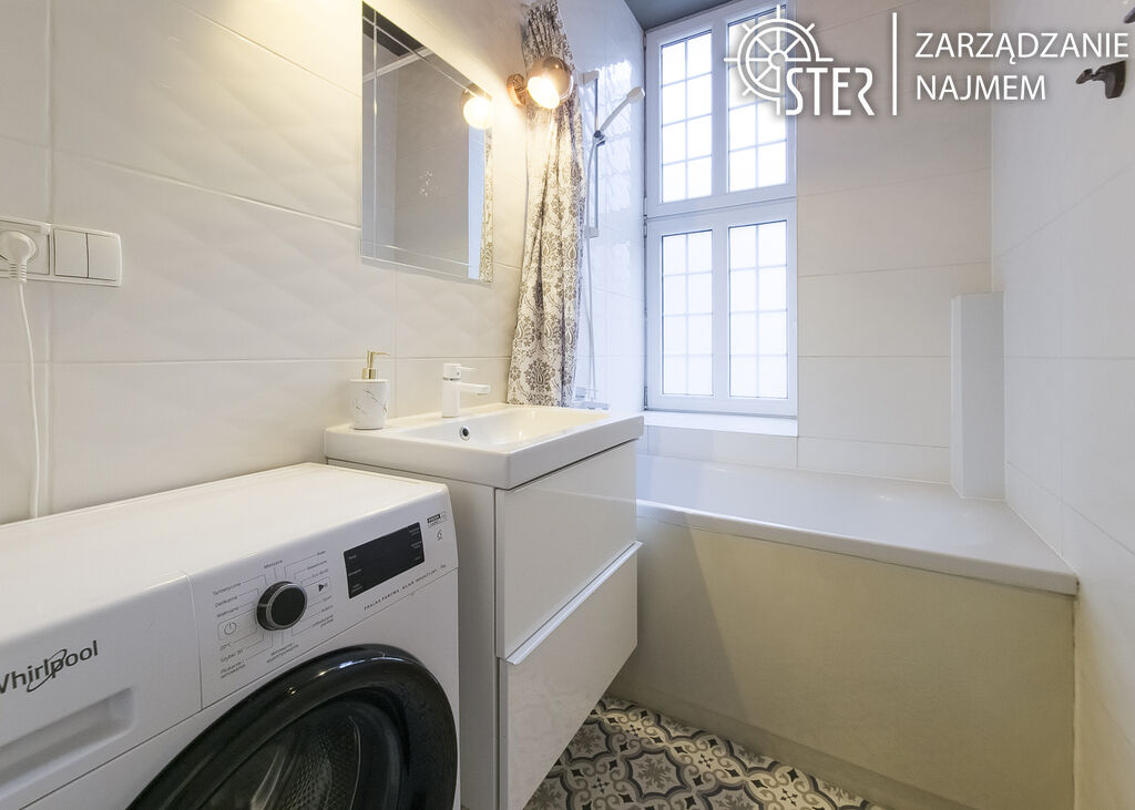 telewizor. W łazience z oknem jest wanna, pralka, umywalka, ubikacja.