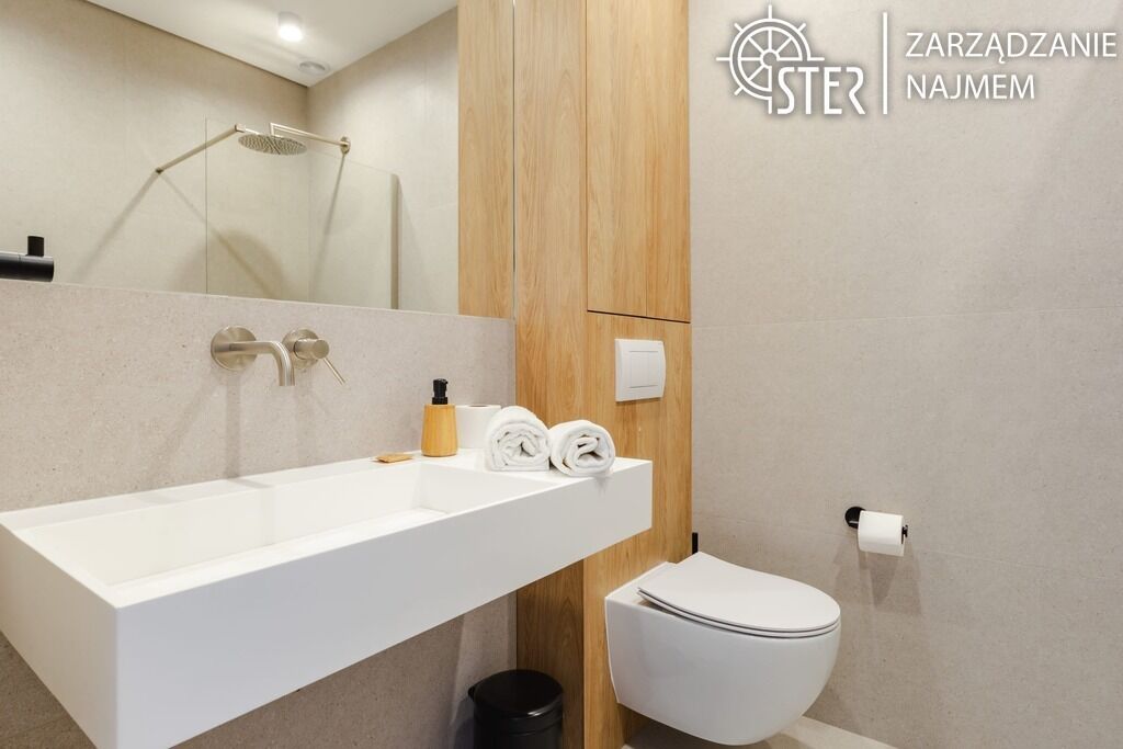 Łazienka wykończona w wysokim standardzie, w naturalnych odcieniach