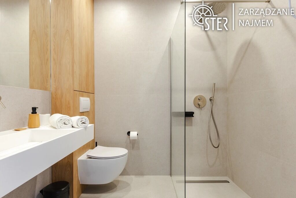 beżu i drewna. Znajdziesz tu przestronną kabinę prysznicową typu