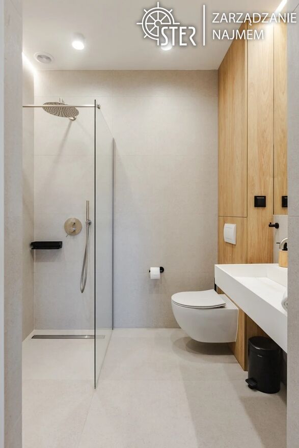 beżu i drewna. Znajdziesz tu przestronną kabinę prysznicową typu