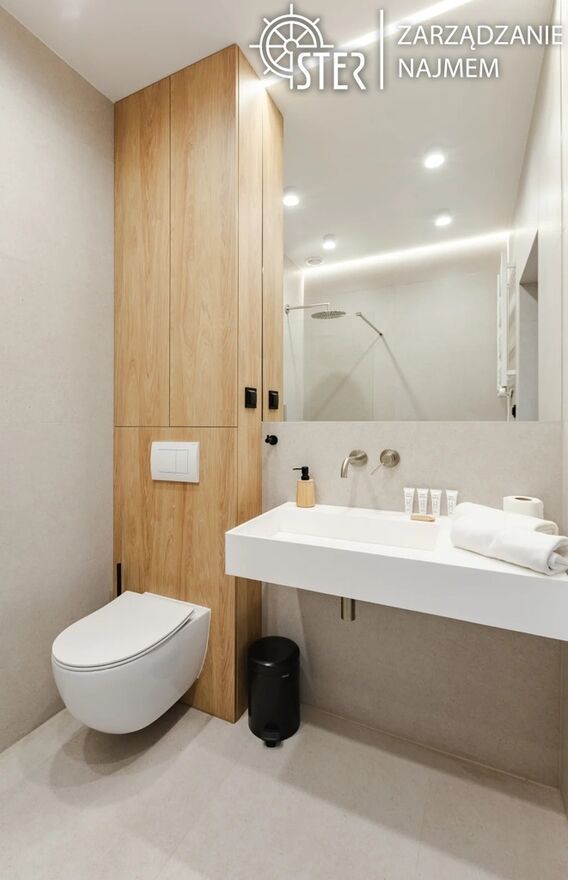 Łazienka wykończona w wysokim standardzie, w naturalnych odcieniach