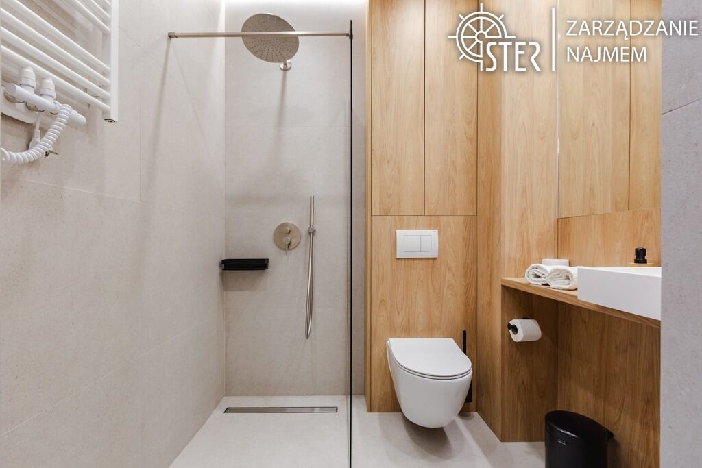 beżu i drewna. Znajdziesz tu przestronną kabinę prysznicową typu