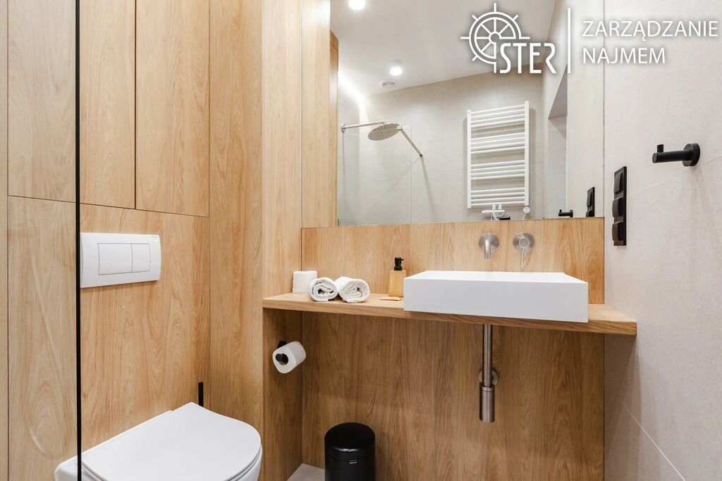 Łazienka wykończona w wysokim standardzie, w naturalnych odcieniach