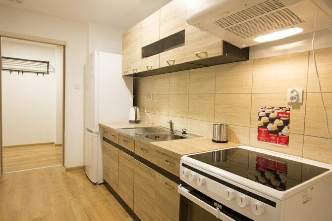 Kuchnia: kuchenka elektryczna z piekarnikiem, duża lodówka, okap,